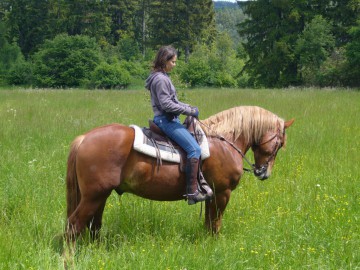 Valach poměrně vzácného plemene, na světě je jen několik set kusů, pochází ze známého chladnokrevného hřebčína Klokočov u Opavy. Umí tahat vůz i svážet dřevo, dokonce má i zkoušky v tahu, ale my ho používáme hlavně k jízdě pro prostorově výraznější :-) zákazníky, s kterými si bez problému poradí v jakémkoliv terénu, také umí pracovat na jízdárně a dokonce i skáče. Vzhledem k šířce hřbetu je velice pohodlný a začátečníci se na něm rádi učí pracovní klus. Na chladnokrevníka má poměrně temperamentní povahu, je velice oblíben u dospělých, kteří si chtějí užít pohodovou vyjížďku a přitom nejet na úplném flegmatikovi.
